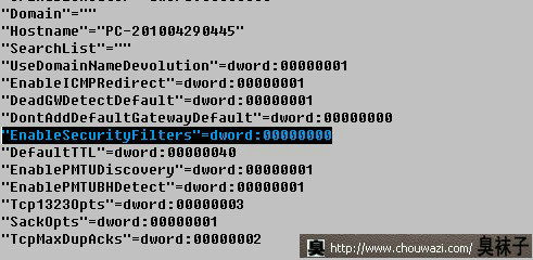 TCP/IP筛选在注册表里有三处,分别是: HKEY_LOCAL_MACHINE\SYSTEM\ControlSet001\Services\Tcpip